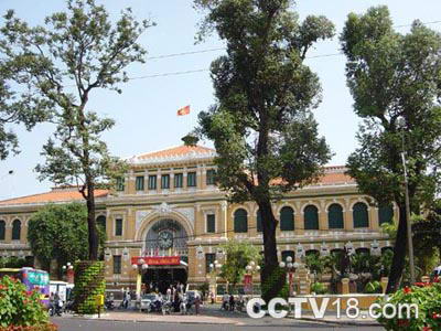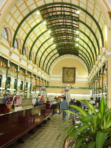 胡志明市中央邮局,建于19世纪末,由法国建筑师设计,大厅内部装饰华丽,圆顶极富古典气息。