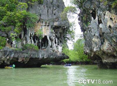 攀牙湾山峰耸峙,海景如画,风光雄浑壮丽,酷似桂林的山水:屏干岛(Ko Pingkan),由两面山峰倾斜地相叠一起,呈倒V字形,山壁如削,平滑如镜。人在石壁下仰首翘望,俨然一线天;塔布山,形状像铁钉一样插在海底,高约30多米,由于受海水的侵蚀而上阔下窄,狼牙棒似的头大后细的山峰,傲然兀立于壮阔的海上,直指云天,气势昂扬。 另外,攀牙湾的金石洞佛寺,也是游人观赏或拜佛许愿的胜地。洞内供奉着一尊巨大的金色睡佛及其它一些佛像,据说十分灵验,因而终年香火旺盛。 而攀牙湾海岸以奇峰异洞著称于世。在从普吉岛前往攀牙湾的旅途沿岸,有佛庙洞(Suwanakhula Cave)和隐士洞(Thum Ruesi)两个石灰岩洞:前者洞内面积宽广,有各式千奇百怪的石笋和钟乳石等,并有一座佛寺;后者规模更大,其岩洞由数十个山峰的底部串连而成,洞内流水淙淙,景色神秘而壮观。 总之,前往普吉岛旅游,攀牙湾是一个绝对不可错过的地方。 交通指南:普吉到攀牙湾可乘坐客车前往,约2个半小时,普通客车26铢(一天5趟)。 |