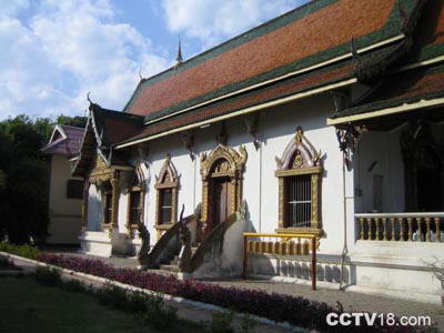 柴尤寺中还有一株老菩提树, 就在七峰塔的后方,被围着许多黄巾,据说是提洛卡拉王为了召开那次佛教大会, 特别请高僧自锡兰释迦牟尼禅定的那株菩提树移来一枝,若是真的,至今以522年了。 广大的草地与树荫,加上散落在其间的7尊各式佛像,好象一个佛像公园。草地上7尊各式姿势的佛像叙述了释迦牟尼禅定前身的一些姿势,别担心看不懂泰文,泰文看板的背面就是英文 看板,解说佛像的姿势与释迦牟尼做此姿势的故事。 |