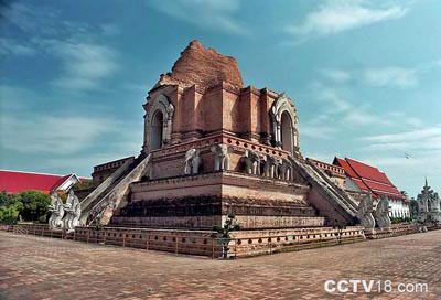 这个混合印度,锡兰式的佛塔原本高90公尺,但在西元1545年一场大地震时倾倒,现在只剩下大约60公尺高,然而500年来,它还是清迈最高的建筑物,泰国顶顶有名的玉佛就曾经放在此塔东面的佛龛里,度过八十多个年头。 柴迪隆寺几乎位于整个清迈古城的中心,寺内另一个参观的重点就是大门入口左边的城市柱(Inthakhin),据说由清迈最后一位 领导者Chao Kawila在西元1800年(有一说是1775年)从别处移过来,并且在旁边植了一株树,这株精神树会保佑这个城市直到它倒下为止。