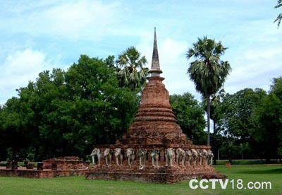 寺中最显著的3座高棉塔从左至右各代表大梵天、湿婆神和那莱天王, 塔中的佛像均移至博物馆中收藏。塔上装饰繁复的灰泥图样仍清楚可见,我们可以仔细观看每一个小佛龛上都有一只龙吐出三只龙的图样,这种传说中的动物叫玛卡拉, 它是大象、蛇和鳄鱼三种动物的混合体, 它会吐出蚋干——似蛇似龙的吉祥物,在泰人的习俗中,奇数是吉祥数字,所以玛卡拉吐出来的一定是1、3、5这些数目。 另外,司里沙外寺的朝向也异于其他庙宇,这是因为高棉人认为祖先来自南方,所以大门开在南方,而整个素可泰古城的寺庙皆面朝东方。 |