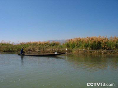 茵莱湖也有人称它梦湖、奇幻湖,传说此湖是湖之仙子茵撒斯Inthas的家。茵莱湖上有二百多个水上村落,彼此间有大小水道相通,每条水道也和陆上街道一般各有名字,水道口还有指标标示出通往的村子及公里数,只差没有红绿灯和交通警察,但大家都很遵守交通规则,在茫茫湖面上绝不会发生交通事故。 茵莱湖有三大奇观:一是有缅甸最大的水上集市——“伊瓦玛”;二是有罕见独特的浮岛村落和浮岛种植法;三是有用脚划船的茵莱人。 从良瑞镇码头乘装有马达的长形木舟,经过长约五、六公里的河道,便驰入湖心。纵眼一看,湖水湛蓝,水天一色,浩瀚无边,仿佛置身大海。沿途有一群群海鸥追逐迎宾,若投食空中,海鸥便作飞行花样表演,煞是可爱。船在湖中破浪前进,不时与茵莱人擦肩而过,他们那种独特的用脚划浆的方式令人惊叹叫绝,过目不忘。划船者站在船的尾端,一只脚踩在船板上,一只脚悬空荡浆。如用左脚划船,则用左手握住浆把;用右脚划船,则用右手握浆。划船时,手、腰、脚同时用力,使小船飞速向前行驶,而不划船的手和脚却起平衡作用。在扁舟上摆着一个圆锥状的大竹笼,那就是他们的捕鱼工具——罩鱼笼。他们根据鱼换气时冒出的水泡断定鱼的大小,看准后便将鱼笼插下去,若有震动的手感,再将鱼叉从鱼笼上端的孔中伸进去,把罩内的大鱼叉上来。在粼粼碧波中向南行进约半小时,新的奇观又出现了:只见湖中漂浮着一个个岛屿,有大有小,错落分布在湖面上。岛上长着庄稼和草木,真乃绿岛也!透过绿荫,可窥到一栋栋农舍和寺塔。靠近细看,便发现这些水上建筑有两种建筑法:一是在土层厚的浮岛中心建房,仍采用打地基建筑法,与陆地施工法无异;二是采用打桩法,将柱子的一头打入水底,另一头则露出水面约一米多高,然后在桩上铺木板,建成水上阁楼。“水上人家”以浮岛为单位组成“水上村落”,每个村之间都隔着湖水,遥遥相望,鸡犬之声相闻,村民们甚至可以相互调大嗓门传递信息。若两座浮岛距离较近,便架起拱形竹桥或木桥,这样桥上人来人往,桥下小舟穿行如梭,构成一幅幅“小桥流水人家”的水乡风景。 在浮岛群中央,有个叫“伊瓦玛”的水上集市。它由两座狭长的浮岛夹一条宽约40米的“河道”组成,“河道”两岸商店林立,日用百货齐全,使“河道”成为一条长长的“水上大街”。“街道”上船来船往,运来蔬菜、瓜果、鲜鱼和其他农副产品,停靠在“街道”两边出售,显得十分繁华和热闹,还可泛舟湖上,瞻仰那东枝附近的彬得亚古石窟。