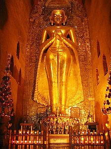 在塔的内部,是一座样貌庄严的释迦立佛像,佛微微地低着头,俯瞰着他脚下的芸芸众生。整座塔宏伟壮观,处处显示出工艺精湛,集缅甸古代建筑艺术之精华。这会儿正值早上,是缅甸人拜佛的时候,缅甸人对佛的朝拜是每天的必修课,他们认为,在佛像前祈祷,然后献上一束鲜花,就如吃饭睡觉一样,是生活中不可缺少的部分。 四面拱门内各有一高18英尺独木雕刻的佛像,分别用檀香木、柚木、松木和玉兰木雕成,形态逼真,栩栩如生。其中一尊佛像,当你站在佛像前仰视时,佛像面容庄重;但后退20米处再看时,佛像开始微笑起来,面容慈祥可亲。佛塔内外的墙壁上有数不清的精美壁画、浮雕和佛像,阿难陀佛塔,造型新颖,比例适中,采光和通风良好,兼之拥有大量的雕刻和壁画,实为缅甸佛塔之佼佼者。 |