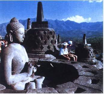 在1006年,婆罗浮屠周围的居民因地震和附近一座火山喷发而纷纷逃离。这个地区似乎已被遗弃,直到1814年才重新被发现。在20世纪70年代和80年代,对婆罗浮屠进行了一次大规模的修缮,用电脑技术将石块进行复位。1991年底,婆罗浮屠被列入联合国教科文组织的世界遗产名录。目前,整修后的婆罗浮屠古趣盎然,风貌如初,已被印尼政府扩建为面积达85公顷的游览胜地,是外国游客首选的旅游景点之一,每年吸引世界各地数十万佛教徒和旅游者到这里朝拜或观光。 婆罗浮屠是实心的佛塔,没有门窗,也没有梁柱,完全用附近河流中的安山岩和玄武岩砌成,约用200万块石头。佛塔的基层呈四方行,塔基地面部分战地1.23万平方米。从塔底到塔顶最尖端,原高42米,塔顶钟形大佛龛的尖端因触雷而被毁掉,所以实际高度不到35米。塔的建筑形式体现大乘和密宗教义的结合,整个建筑物犹如一个巨大的曼荼罗(坛场)。佛塔共有10层,四周的中间各有一条笔直的石级通道,由基角直到达顶层。佛塔第一层至第六层是四方形,第七层至第九层像是顶塔的座脚,呈圆形。第十层是钟形的大塔,直径9.9米。