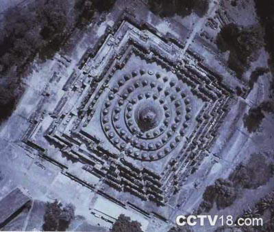 “婆罗浮屠”,就是建在丘陵上的寺庙的意思。它大约建于公元778年,长宽各123米,高42米,动用了几十万名石材切割工、搬运工以及木匠,费时五十至七十年才建成,是世界上最大的佛教遗址。随着15世纪当地居民改信伊斯兰教,婆罗浮屠旺盛的香火日渐衰竭。后因火山爆发而遭堙没。直到十九世纪初,人们才从茂盛的热带丛林中把这座宏伟的佛塔清理出来。1973年,婆罗浮屠佛塔得到了联合国教科文组织的资助,开始了大规模的修复工程。 婆罗浮屠佛塔是由100万块火山岩一块块巨石垒起来的十层佛塔,可分为塔底、塔身和顶部三大部分。塔底呈方形,周长达120米。塔墙高4米,下面的基石亦高达1.5米,宽3米;塔身共五层平台,愈往上愈小。第一层平台离地面边缘约7米,其余每层平台依次收缩2米。塔顶由三个圆台组成,每个圆台都有一圈钟形舍利塔环绕,共计72座。在这同一圆心的三圈舍利塔中央,是佛塔本身的半球形圆顶,离地面35米。