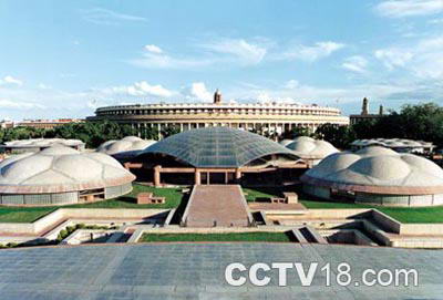 位于总统府的东北面,外观采用圆盘形状,主体四周为白色大理石圆柱,其建筑风格融合了印度传统风格与维多利亚时期的特点。内部墙上是一幅幅记载印度历史的壁画,充满了庄严神圣的气氛。国会大厦是一座现代化的建筑,环绕着水池,周围宽阔的草坪上圆形的列柱成排,格调十分高雅,是新德里最美的地方。 |