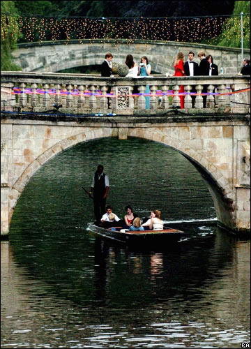 “剑桥”原本是架在剑河上的桥,似唐装连接左右的扣链,散落两岸的是难掩光芒的各类学院。从小码头上平底小舟,顺流而下,岸堤垂柳,绿茵如盘,尖塔棋布,学子志存高远,游者心旷神怡。由南及北,可依次欣赏到石楠盛开的王后学院(建于1448年)、院墙高抱的国王学院(建于1338年)、古朴幽深的三一学院(建于1546年,查尔斯王子母校)等等。在哥特式建筑的圣约翰学院(建于1511年,学生最多,规模最大)附近的叹息桥(形同我国古老的赵州桥)前折返,再去揣摩北边王后学院,那座周身没有一颗钉的数学桥,据说是按照几何原理建造的。河东,有一座修道院法庭,15世纪风貌依旧。跨入建于1515年的国王学院礼拜堂,此乃剑桥建筑之象征。1918年始,礼拜堂内的唱诗班享誉全球,每年的圣诞夜,其美妙歌声向全世界放送。如果想在礼拜堂内亲耳聆听圣诞圣歌,至少要排上六七个小时。暑期8月,剑桥学子还会尽情献演莎翁的戏剧,浓浓的文艺气息,荡漾在剑河之上……