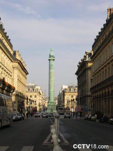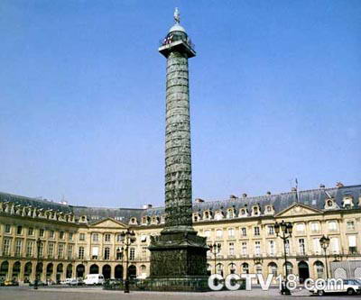 整个广场风格简朴、庄重,建筑格局是巴黎精神和风格融合的缩影。广场中央耸立着为拿破仑建造的旺多姆青铜柱,是用1805年在奥斯特里茨战役中赢得的1200门炮,熔化之后铸成的,高44米,顶上是拿破仑的雕像。