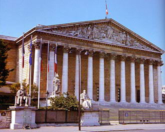 波旁宫又名国民议会(Assemblee Nationale),坐落在塞纳河南岸,占地相当大,除了议会厅外,还有一系列的附属建筑,足足有百间间,它的正面面对着「大学之道」(Rue Universite),后面面对着協和大桥与協和广场,是具有260多年历史的古典建筑,这座半圆形大厦规模雄伟,北门12根大圆石柱组成的宽阔柱廊,承托着一个三角形横楣,上面饰以通体浮雕,柱廊下的30级台阶两侧有6尊雕像。它是1722年为路易十四的女儿波旁公爵夫人建的,由此得名。