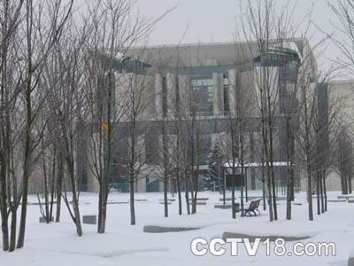 建筑上部18米高的半圆形是主楼的标志。联邦总理府的玻璃外墙使建筑透明、宽阔,12米高的石柱使玻璃外墙结构清晰,并产生了内外响应的透视效果。联邦总理府两翼为办公区,主楼入口大厅宽阔宏大,用于接待贵宾。 |