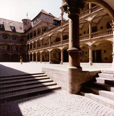 早在1320年符腾堡伯爵就让人在这个地方建造了一座防洪城堡。1553年至1570年间,这座防洪城堡被改建成文艺复兴风格的国家城堡。同一时期,城堡内的阶梯被加宽砌入了一个马骑阶梯。以方便那些肥胖笨重的或是喝得酩酊大醉的德国贵族们从那儿直接骑马上梯。打道回府。