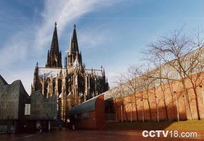 登上钟楼可以眺望科隆市貌和风光。每到夜晚,装在四周建筑物上的聚光灯向教堂射出光柱,为它罩上一层淡兰色荧光。站在莱茵河对岸欣赏河水中教堂的倒影,更是神秘莫测。 |