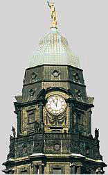 在他们的设计里甚至能看到青春艺术风格的痕迹。楼梯间的圆拱形天花板绘满了精美的图画。98米高的钟楼顶上立着一座5米高的镀金市政厅人物塑像——这是德累斯顿的城市标志之一。 |