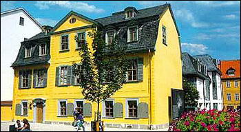 席勒故居(Schillers Wohnhaus)在歌德故居北边,步行只需五六分钟。在1802年,弗里德里希-席勒(Friedrich Schiller)买下这幢三层小楼,和他的妻子夏洛特(Charlotte)以及4个孩子在这里一直生活到1805年他去世。在1826年他的妻子也去世后,这幢房子被出售,20年之后,1847年魏玛市政府买下这幢房子,并且开放席勒书房,之后又开放了阁楼的全部房间,来让人们纪念席勒,故居的其余部分被作为德国席勒文化交流的场所,也作为歌德文化交流场所。在1984年到1988年通过考古研究和复原工程,故居被全部恢复了原貌。内部被复制成席勒时期的样式,部分的装饰品也用了原始的物件。席勒的书房,工作室和席勒用过的家具都在第三层的阁楼上。靠窗的书桌上放着他用过的羽毛蘸水笔、墨水瓶、镇纸、纸剪、烛台和鼻烟壶。他在这里写下了《墨西拿的新娘》和《威廉·退尔》。1805年,当席勒感到自己病况恶化时,为了继续工作,叫人把病榻搬进工作室,后来他在工作室里与世长辞。二楼是他的妻子夏洛特以及4个孩子的卧室。第一层是厨房,仆人房,还有用来展示这座房子以及席勒在魏玛社会地位历史的展室。