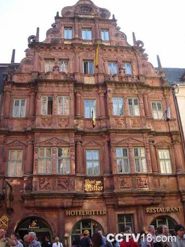 在市集广场与圣灵大教堂相对的是骑士之家Hauz Zum Ritter,骑士之家又称圣乔治骑士之屋Hauz Zum Ritter St. Georg﹞,年龄比古桥老一倍,始建于一五九二年的文艺复兴后期,算起来也有四百年的历史,是海德堡内经1693年法国人因王位继承权所引发的战争期间极少数未被破坏的漂亮建筑,原为民宅,后改建为大饭店。 饭店外墙刻绘有骑士的胸像,历经四百年, 看起来依然栩栩如生。 |
