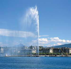 位于日内瓦湖上,全年开放的日内瓦大喷泉是日内瓦的标志。它位于湖畔左岸,Jetèe des Eaux-Vives尽头一支高1.85米的钢柱是喷泉源头所在,它将湖水喷到140米的高空,非常壮观。喷泉由电力泵压出,射上高空时的压力达七吨以上。在1891年,作为城市的装饰性景点,喷泉移到了日内瓦湖上现在的位置,当时喷出的水柱高约82米。在刮大风的情况下,有时也停止喷水。
