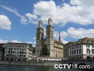 这个教堂建于11世纪到12世纪初叶,有两座塔,建筑样式非常独特。据说,是在卡尔大帝建造的基督教堂的基础上建成的,在地下还有他原来的石像。脸朝着湖坐在教堂窗户旁边的,也是卡尔大帝。1519年,兹温格利作为第一传教士来到这里推行宗教改革。这里的彩画玻璃,是贾科梅蒂的作品。