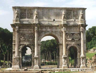 君士坦丁经常被认为是第一位皈依基督教的皇帝,但是在这座在315年为他而建的拱门上找不到任何基督教的形象。他的洗礼仪式仅是在22年后在他临终之际举行的。尽管君士坦丁拱门建造得格外雄伟气派,它却没有自己的独特风格。这座拱门上面的绝大多数装饰品其实都是取白于以前的皇帝们所建造的各种建筑物,这也表明罗马的艺术已经开始走下坡路了。 |