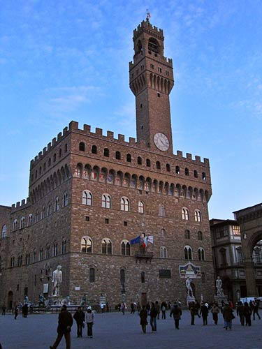 韦奇奥宫(Palazzo Vecchio)是过去佛罗伦萨共和国的国政厅。建筑入口处装饰着带有城市徽章的佛罗伦萨的狮子像 Marzocco。