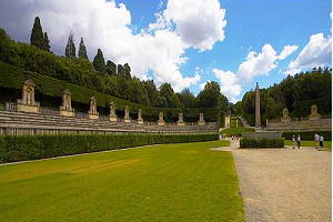 波波里庭园位于皮蒂的内侧,是典型的意大利式庭园,山丘上是一片自然的绿色。还有椅子,带上饭盒正好合适。从宫殿左侧进入后,首先映入眼帘的是人工钟乳洞及骑在乌龟上胖胖的小人的喷泉。这是以为科基奖一世表演的小丑作为模特建造的。穿过露天剧场,沿着种有松树和杉林的小路走,就到了一个柠檬与柑橘都长得很繁茂、还有小鸟的广场Piazzale dell’Isoletto。再往前走,山丘顶上有贝尔维德勒要塞,从这里眺望佛罗伦萨的街景让人难忘。