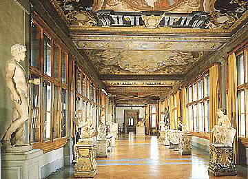 乌费兹美术馆 Galleria degli Uffizi这里因为曾经是梅迪奇家族的事务所,文艺复兴时期凝聚了梅迪奇家族财力的全部艺术作品都在这里。这里有波蒂切利的感官性的《春》和拉斐尔的《荷瓦的圣母》等。收藏品达2500件之多,参观至少要花半天时间,真正理解则要花1星期时间。 美术馆分为二层和三层。二层是列奥纳尔德、米开朗改罗等人的素描及版画的展室。三层是绘画馆,三段走廊之间有45个展室。从这里到河对面的皮蒂富有巴扎利走廊连接,这条长廊现在是达芬奇、提兹亚诺等画家们的自画像的展览馆。