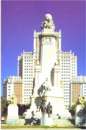 在这座1930年为纪念塞万提斯而修建的广场上,塞万提斯雕像好像在俯瞰着唐吉诃德和桑乔——潘萨的雕像一般屹立在广场的正中。在雕像背后的大楼是西班牙大厦(Edificio Espa a)。旁边是1948年建成的当时欧洲最高的马德里塔(Torre de Madrid)。