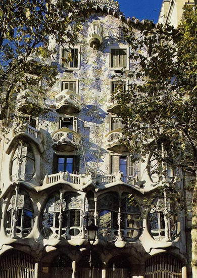 巴特罗公寓的入口和下面二层的墙面都故意模仿溶岩和溶洞,上面几层的阳台栏杆做成的假面舞会的面具模样,屋脊如带鳞片的兽类脊背,屋顶上的尖塔及其他突出物体都各有其怪异形状,表面贴以五颜六色的碎瓷片。