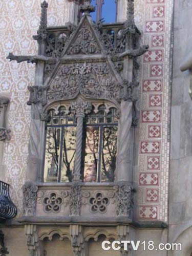 巴特罗公寓(Casa Batllo)的外墙缀满了蓝色色调的西班牙瓷砖。这座6层楼建筑物很怪异,它的露台设计像骷髅头,柱子像一根根骨头,屋顶则像满布鳞片的鱼背。 |