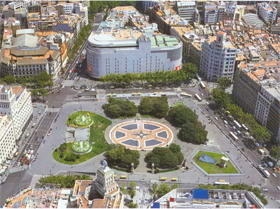 鸽群在广场上的大型花坛之间漫步,两座巨大的喷泉装点着这个巨大的空间,有Josep Clarà的雕塑《女神》和Pablo Gargallo所作的《城市象征》和《牧羊人》青铜像。广场的另一端是加泰罗尼亚管区主席Francesc Macià纪念碑,Josep M. Subirachs的作品。广场的地下有商店、停车场、两条地铁线及其车站等构成的繁忙网络。 |