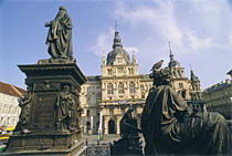 格拉茨市政厅位于老城区中心广场的市政厅(Town hall)是16世纪中期文艺复兴时期的建筑, 高高的连环走廊给人以庄严壮丽之感。院中一角有一个很别致的圆形大理石的喷水池,四周用5根美丽的青铜柱围着,每根铜柱的柱脚都做成半人半山羊的形状,共同支撑着一座雕刻精致的青铜凉亭。
