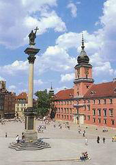 在王宫广场中心,耸立着泽格蒙特三世瓦扎圆柱纪念碑,是由瓦迪斯瓦夫四世为纪念其父泽格蒙特三世瓦扎迁都华沙于1644年兴建的。圆柱高30米,人像高2.75米。站立在圆柱上的泽格蒙特三世头戴王冠,身披战袍,手执利剑和十字架。民间传说国王宝剑的指向含有不同的意思:向上指时,象征胜利和幸运;向下指时,预示厄运和衰亡。 |