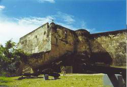 耶稣堡位于蒙巴萨老城的东南角,呈“大”字型,长一百多米,宽约80米,2。4米厚,非常坚固。城墙根上是靠着二支巨大的铁锚,从其锈蚀程度上看出岁月沧桑,寓意着承包与航海的关系。在城堡顶端平台的一侧是博物馆,展示着东非与新航路历史的图片与文物 |