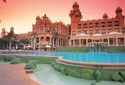 失落城外表用南非特有的岩石建造,建筑入口处形如皇宫,典雅华丽,雕刻细致,各项动物的铜饰,巨大豪华又能显出南非特色。