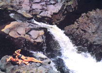 急流峡谷是哈纳海岸最著名的景点。在离哈纳10英里的地方,31号公路穿过一座拱桥。在桥的左侧可以看到低处的池水倾泻入海。向前走不远就是公园管理处和一个大的停车场。那里有清晰的路标指引游客走近低处的水池。高处的水池更有意思,很少有人会爬得那么高,您就可以单独享用一个游泳池了。 |
