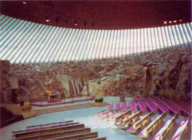 岩石教堂是几乎所有造访赫尔辛基的游客的必游之地。因为这座闻名欧洲的教堂是从一整块岩石中开凿出来的。岩石比旁边的街道高出8至13米,顺其自然地保留下来; 环绕四周的建筑是不同年代修建起的住宅楼。当游客乘车来到教堂外的时候,映入眼帘的是一块巨大的岩石,看不到一般教堂所具有的尖顶和钟楼,只有一个直径20多米的淡蓝色铜制圆形拱顶暴露在岩石的最上面。教堂的正厅可以容纳约750人做礼拜。除了各种宗教仪式,岩石教堂里还不定期的举行包括交响乐在内的各种音乐会。 |