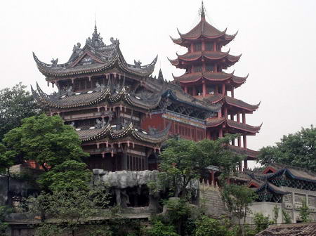 寺内“大雄宝殿”为明代宣德七年建筑,为“重庆市文物保护单位”。大雄宝殿的殿柱是约两人合抱的马桑树,其余殿宇的柱子直径不过一尺大小。而大雄宝殿的建筑内外结构未用一颗铁钉,而且是全木结构的。殿中两桩刻有盘龙抱柱,栩栩如生。 最奇的是两柱础石,一柱凸出地面尺许,一柱凹下几寸,但两柱平衡。历时千年之久,全殿无歪斜之影,真可渭天工巧匠,堪称一绝。大雄宝殿佛爷座像前一井,可通嘉陵江河边的“九石缸”,曾有人以鸭投入井内,事后在“九石缸”发现。此并在平时用石鼓盖上的。最使这千年古镇增色不少的是,有不少的名人来过磷器日古镇,不少已成为老人们回忆的佳话。 |