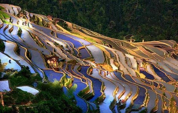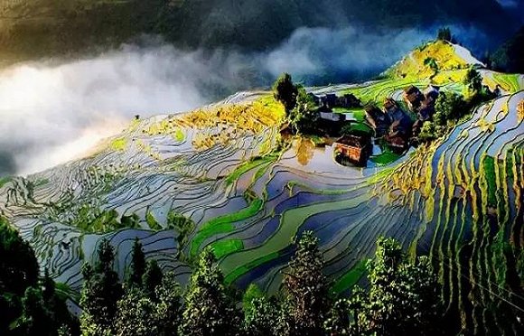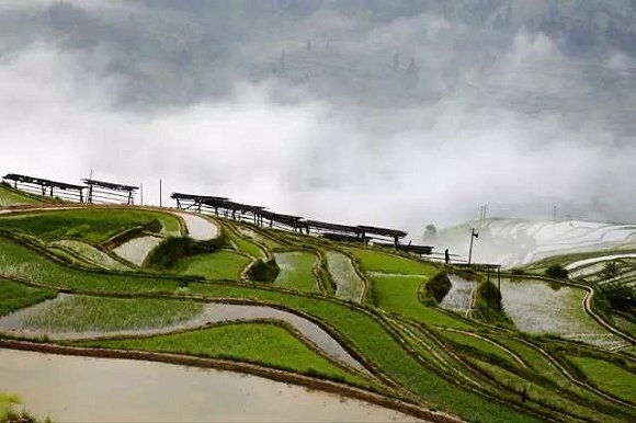 无论春夏秋冬,每天清晨,一层层云雾从河边缓缓升起,这些美丽的梯连同梯田边上的苗乡吊脚楼全都被笼罩在云雾中,远远望去,吊脚楼若隐若现,让你在陶醉中生起一种身在幻境的错觉。
