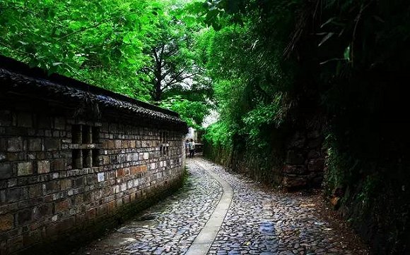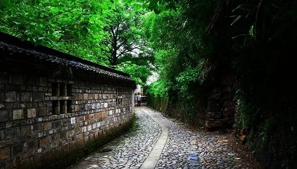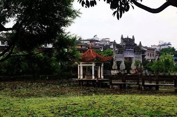 四面青山环抱,村前绿水环绕,一座座洗衣亭和石拱桥掩映其间,堤外荷塘飘香,一派韵味无穷的农家田园牧歌画卷。