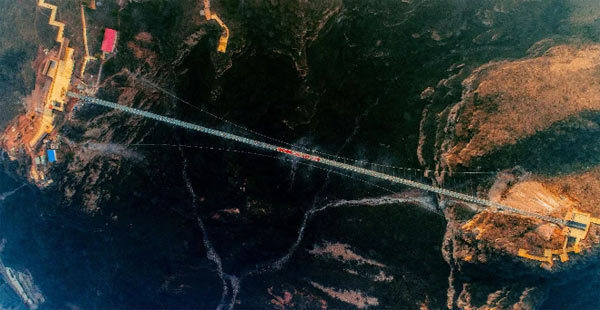 Two other glass walkways lace the mountain range, one of which was formerly the world's longest but is still currently the world's highest at 300 meters. 还有另外两条玻璃栈道横跨在山峰之上,其中一条曾是世界最长玻璃栈道,不过如今仍是世界最高栈道,高度为300米。 Also on hand for adrenalin junkies who just won't quit is the world's longest cable car ride, which spans seven kilometers and takes 30 minutes to complete. 没玩够的肾上腺素上瘾者还可以尝试一下世界最长缆车索道,全程达7公里,需乘坐30分钟才能到达。 The world's new longest glass bridge at Hongyagu, Hebei 目前世界最长的河北红崖谷玻璃吊桥