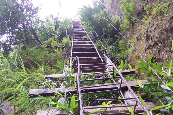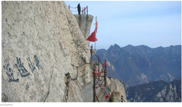 It's a hefty 1.5-hour hike from the valley floor to the platform, or you can make your head spin twice in one day and take the cable car up. 从峡谷底部徒步走到玻璃观景台需要1.5个小时之久,不过,如果你想一天晕两次的话,也可以乘缆车上去。 It's constructed with titanium alloy, the material used in airplanes and space shuttles, so it can apparently hold a maximum load of 150 tons and 2,000 people. 玻璃观景台用钛合金建成,钛合金是用于制造飞机和航天飞机的材料,所以这个观景台的最大承重力为150吨,最多可承载2000人。 Hiking horror at Mount Huashan, Shaanxi 惊险:徒步登上陕西华山