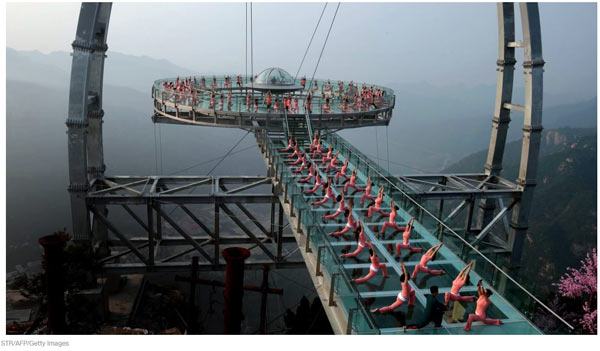 Having stolen the crown from Tianmen Mountain, the new draw to Hebei province's Hongyagu Scenic Area is now the world's longest glass-bottom bridge. 河北红崖谷景区的新景点夺去了天门山的光环,成为了世界最长玻璃吊桥。 And what makes a 488 meter-long glass bridge above a drop of 218 meters even more scary? Its suspension cables make it sway. 让长488米、垂直高度218米的玻璃吊桥更惊悚的是什么呢?那就是晃动的悬吊钢索。 The bridge, made up of 1,077 glass panels of four centimeters thickness, strings together two peaks in the region. 这座连接该地区两座山峰的吊桥用1077块4厘米厚的玻璃嵌板铺成。 Although it can apparently accommodate 2,000 people, only 600 are allowed on at any one time, shuffling along in special "shoe gloves" to protect the glass. 虽然吊桥可以容纳2000人,但一次只允许600人在桥上,而且为了保护玻璃,游客还要穿特制的“鞋套”拖着脚过桥。 Staff are strategically positioned along its length to help those with jelly legs find their feet. 工作人员会巧妙地分布在吊桥上,帮助那些吓得脚软的游客站起来。 The world's biggest glass viewing platform at Shilinxia, Beijing 北京石林峡的世界最大玻璃观景台