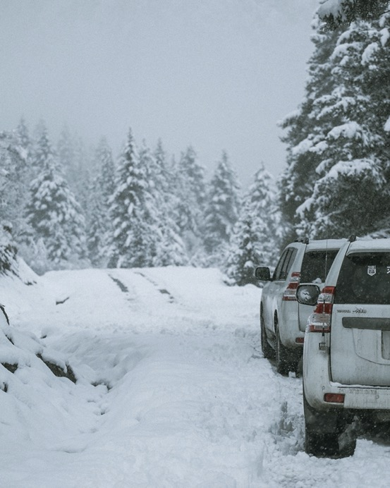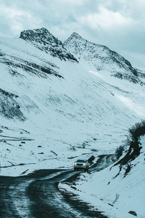 海拔上升到4000左右的时候道路两边就全是积雪了,至于海拔数的反馈自然是PRT-B70的功能,手表内置四重感应器用小而强悍来形容不为过。对于户外有专业需求的人,PRT-B70的四重感应器数据反馈及时且准确。这也是我在使用一段时间对于手表专业性上的反馈。 满是积雪的路面自然也是给上山的过程增加了不少难度,加上之前曾经三次来到这里都是因为积雪太深导致无法上山,这次虽然遇到了大雪,所幸道路上积雪还在能接受的程度,加上十月下旬温度还没有下到零下所以道路虽有积雪也不至于结冰,也许老天爷看我们多次失败未果以及我们的决心给我打开了这片世外仙境。