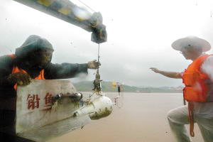 19日,寸滩水文站的技术员和水手在长江寸滩水域冒着大雨测量涨水期间的水流量。据来自寸滩水文站的数据显示:当天下午6点,寸滩长江水位为172.86米,流量为2.89万立方米/秒。(重庆晨报供图) |