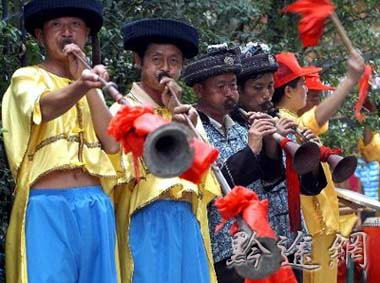仡佬族聚居区地处黔北, 在贵州与四川交界处,是云贵高原向四川盆地过渡的斜坡地带。 仡佬族的姑娘出嫁前三五天就会开始“哭嫁”。娶亲时新郎不会去亲迎,而是于婚期前一日派轿夫到天黑的时候去女家。在进门之前,女方有专人主持“栏门礼”,要行敬酒、铺毡、恭候等礼数,每道程序都有传统的对答礼词,必须说唱得合乎规矩,否则要遭轰笑。姑娘出嫁时先将花轿抬进堂屋,由新娘的兄长或叔叔将新娘“拉出” 里屋,给祖宗父母磕头,尔后“强抱”入轿中,表示对娘家恋恋不舍。娘家人把轿子抬出村寨外,才交给男方轿夫。轿前有两人持大刀开路,花轿周围有彩旗和蓝伞簇拥,途中鸣号放炮,吹吹打打,非常热闹。到新郎家拜堂后, 新娘要重新梳妆打扮,然后到寨中宽敞处让大家欣赏、逗笑,以便和乡亲们建立友好感情。 在黔西北的仡佬族,婚礼更有趣。新郎骑马去迎亲,有4个伴郎相陪,其中2人扛着竹扫帚,另2人抬着酒肉礼物。途中有女方派出的几个壮汉栏路“抢劫”,把“抢”来的酒肉在山坡上吃掉,表示女家富有,不稀罕你这点礼品。新郎到了女方寨门,有一群人手执木片围“打”新郎,男方执竹扫帚者要全力保护突围。新郎跑进女方家门,马上有“敬亲酒”招待,而且新郎与新娘也相互敬酒。敬酒毕,新郎将新娘“抱”上马背,新郎执缰引路而归。 隆重的婚礼宴席要分二台或三台,即要连续吃二三 道不同的席。第一台是茶席,只吃清茶、油炸食品及干鲜果品。第二台是酒席,要喝白酒,吃各种凉拌拼盘。第三台是正席,除必有两碗扣肉外,还得有各种烹炒的民族风味。 婚宴中,仡佬族还用咂酒招待客人。咂酒是将酒酿好后密封于外抹柴灰拌黄泥的坛中,密封时就插有两根竹竿,一弯一直,竹节没有完全打通。饮用时打通竹节,直管进气,弯管咂吸而饮,饮酒时有专门唱“打闹歌 ”的歌手助兴,使客人感到一片温馨。 高台舞狮 仡佬族的民间高台舞狮,是很受群众喜爱的娱乐活动,具有杂技艺术的特色。高台是以8至12张大方桌一层层叠垒而成,最上面的桌子四条腿朝天,总高度10多米,一个舞狮班子,少则四五人,多则十五人。一般同时登台表演的是4人。两个人扮狮子,把狮头狮皮披盖在全身,只露两脚,另外2人分别装扮成孙猴和笑脸和尚。有时还有同时出场的小狮子。“孙猴”和“笑脸和尚”挥舞手帕逗引大狮子逐层攀上高台,直至顶端 。上攀的动作十分惊险,有正上、倒上、翻上,“小猴 ”与“和尚”、“小狮”与“小狮”一正一倒向上;大狮子有直上、穿上、穿绕桌子螺旋上,到最高处还要四脚踩桌腿表演,不带任何保险绳索。所表演的技巧,都 有生动形象的名目,如“燕子翻飞”、“蛤蟆抱崽”、“鳌鱼吃水”、“雏鹰展翅”、“鲤鱼晒肚”、“蜘蛛吊线”、“仙猴摘桃”、“滚龙抱柱”、“冲天倒立” 、“靠背翻”、“踩高桩”、“叠罗汉”、“旋风车” 等。一个舞狮班有时可连续表演四、五个小时,有些动作使人屏息敛气,怦然心动。有些动作又因滑稽可笑而使观众忍俊不禁。 |