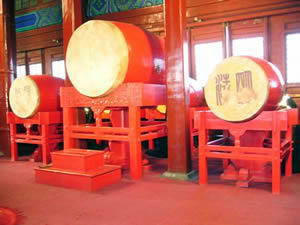 鼓楼中新制成的大鼓 钟、鼓二楼位于北京中轴线的北端,与南面景山遥相呼应,互为借景,是研究北京城市规划布局的重要实物。 |