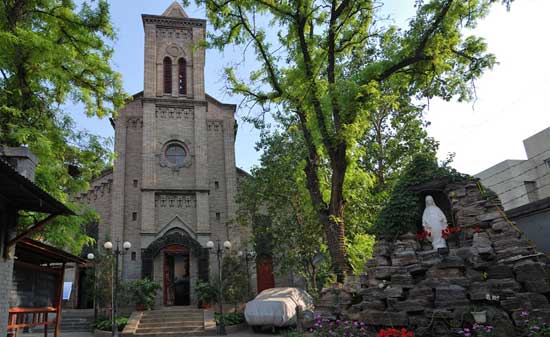在人口稠密、胡同弯转的崇文区幸福大街永生巷,有一座哥特式建筑格外引人注目,这就是距今已有80年历史的南岗子天主教堂。 崇文区现有天主教徒500人左右。每年的“圣诞节”,“复活节”、“圣母升天节”、“圣神降临节”等节目和平常的宗教活动,都在南岗子天主教堂举行。尤其是宗教的“四大”节日,参加活动的教友近千人次。该教堂是北京东南地区天主教友宗教活动的主要场所。 南岗子天主教堂现占地面积近0.2公顷,除教堂外,附设小德胁撒修女初学院。教堂始建于1910年,由东交民巷天主教堂柯来孟神父、仁爱会修女依搦斯、若瑟会修女夏大姑等人共同筹建。1923年,仁爱会修女们集资2万银元,对南岗子教堂进行了改建和扩建。在放生池胡同(即现在的永生巷)购买坟荒地2.8公顷,新建教堂一座,即南岗子天主教堂。包括圣堂、神父院、厨房院等,还建学房7间,名为“惠我第四分校”。 新中国成立后,南岗子天主教堂经历了3次较大的变化。第一次是1952年修女院作为孤儿院使用。第二次是1958年,国家动员宗教团体参加社会主义建设,教会在该年年底将教堂关闭,以后又将大部房间交给区教育局使用。第三次是1978年,党的十一届三中全会以后,重新落实宗教政策,1986年2月,将南岗子天主教堂恢复使用,于同年9月1日经视圣正式开堂,并恢复了修女学校,正式定名为“小德胁撒修女初学院”,到目前已招收了两期30余名学员。为保护这座具有宗教文化价值的教堂,1988年,南岗子天主教堂被列为崇文区文物古建筑重点保护单位。