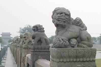 卢沟桥还以其精美的石刻艺术享誉于世。桥的两侧有281根望柱,柱头刻着莲花座,座下为荷叶墩。望柱中间嵌有279块栏板,栏板内侧与桥面外侧均雕有宝瓶、云纹等图案。在281根桥望柱上有姿态各异的大石狮,另有若干小石狮分藏在大石狮的头上、身前、背后和爪下,大小石匠狮共496只,令人叫绝。其中大部分石狮是明、清两代原物,金代的已很少,元代的也不多。金、元、明、清、民国各个时期雕刻的石狮使卢沟桥变成了历朝石雕艺术的博物馆。