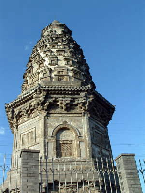 镇岗塔在北京市丰台区长辛店云岗村东的大土岗上,1957年被公布为市级文物保护单位。 塔创建於金代(1115-1234年)。相传塔所在地是一条龙脉,建塔者唯恐龙脉塌毁或逸迁,遂建塔镇之,改称“镇岗塔”。明嘉靖四十年(1561年)重修。 该塔砖结构,平面八角形,实心,总高18米。塔基上有精美古朴的砖雕花饰。塔每边三米,周围24米,系花塔形制。上部用砖雕制出斗拱,在拱眼壁上雕刻盛开的盆花,凶猛的兽头、神像等,极为精细。塔身上挑出短檐,上置须弥座,座上承托七层佛龛,且环绕组成巨大锥花束。第一层佛龛为重层楼阁式方塔,弟二层以上均为单层亭式方塔。第一层塔以上有密布的佛龛环绕,每层内端坐佛像一尊,有的双手合十,有的两手上举,神态壮严逼真。自第二层相轮以上,每面所雕佛像排列整齐。塔刹是在相轮上覆盖八角形座,上置巨大宝珠,塔的外形有明显的收刹。我国现存此类古塔为数不多,此塔值得珍视。 1958年、1982年、2001年进行过维修。 交通指南:339路云冈站,沿云冈北区方向到铁路桥 |