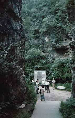 山顶洞人遗址,因发现于龙骨山北京猿人遗址顶部山洞中而得名。此遗址于1930年发现,1933年和1934年经过大规模发掘,计发现人类化石有完整或基本完整头骨3个,头骨残片4件,下颔骨4件,下颌残片3块,脊椎骨、肢骨和零星牙齿10枚。共代表8个或10个男女老幼不同个体。体质形态的发展已和现代人一致。故对研究中华民族祖先体质,具有重要意义。发现石器25件。另发现经过磨制的赤鹿角、一件梅花鹿下颌骨。最有代表性的是发现了骨针和装饰品。骨针长8.2厘米,针身微弯,表面刮磨光滑,一头为锋利针尖,一头是用利器挖成的针眼,但针眼已残。骨针的发现,标志山顶洞人已具备缝制衣服的能力,不再赤身露体。山顶洞人生活年代距今约18000年左右,属于旧石器时代晚期。 附:周口店遗址发掘经过 周口店遗址通常是指“龙骨山”上的8个冠以周口店之名的旧石器时代文化遗址和哺乳动物化石点。从1929年起到目前为止,已编到第25地点。周口店最早发现第6地点,是瑞典科学家安特生于1918年发现的。1921年安特生和美国古生物科学家格兰阶、奥地利古生物学家师丹斯基在再访第6地点(当时叫鸡骨山)后,在烧灰工人指导下,发现了周口店第1地点(当时叫龙骨山)。同年发现了周口店第2地点。1927年步达生将周口店发现的三枚人类牙齿正式命名为“中国猿人北京种”。是年,周口店遗址正式发掘。中国地质学家李捷作为中方代表参加发掘工作,并发现了周口店第3和第4地点。瑞典古生物学家步林也是新地点的发现者,他是唯一仍健在的早期参加周口店工作的外籍学者。1927年以前发现的三枚人牙化石仍保存在他手中。1929年,裴文中发现了第5、7、8地点,找到了在古人类研究史上有划时代意义的“北京人”第一个头盖骨。 |