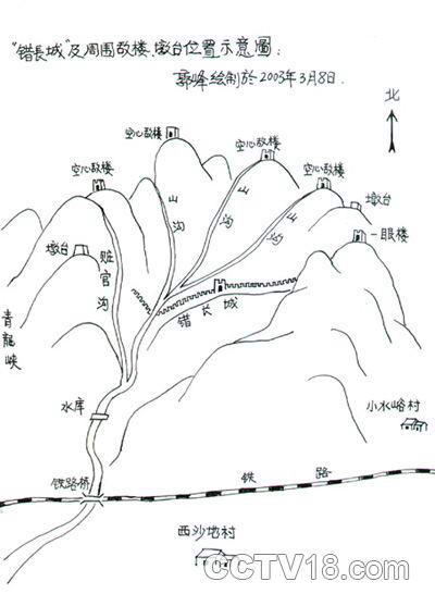 错长城全景 万里长城是我们中华民族智慧的结晶,它与埃及的金字塔一样被称为世界奇迹,然而就是这样一项人类奇迹,在修建的过程中,居然也出现了错误,给这项伟大的工程留下了一个遗憾。 西沙地村是密云西田各庄镇一个名不见经传的小山村,也是一个鸡鸣两县的地方,村子的西南就是怀柔县地界,村西两公里处就是连绵起伏的大山,在山中,有一条南北走向的峡谷叫石塘峪,峡谷两边的山脊上,就是令世人震惊的“错长城”所在地。 错长城当地人叫它“半截子边”,峡谷两侧加起来总长只有400米,与别的长城没有连接,孤零零的一段无记载。严格意义上说,峡谷西面的长城不能算是长城,因为它既没有敌楼,也没有烽火台,只是在谷中的半山坡上用毛石垒了一段长只有十米,高一点五米的石墙就草草收场了。峡谷东面的长城沿山脊而起伏,气势雄伟,地基为凿磨成块儿的大石条,最大的一块长两米,高50公分,在古代没有机械的情况下,不知用什么运上去的。地基上面用青砖衬砌,双层墙体,中间用黄土夯实,依山就势,构筑别致,中间有敌楼一座,分上下两层,楼的构造三明九暗,在敌楼的底层弧形拱顶上,至今还清晰可见修拱顶时荆笆与白灰接触时的荆条痕迹,这在其它敌楼上是非常少见的,为我们今天研究长城敌楼的建筑工艺留下了珍贵的资料。与敌楼相连的东段城墙内侧有拱门一座,据蒋大爷讲,拱门上原有两扇可关开的石门,石门前是石条衬砌的台阶,走进石门内,是依城墙左右内壁衬砌的两个石条台阶,沿台阶可以上东西两侧的城墙,而城墙的外侧是砌死的,这样的拱门在其它处长城中是极少见的。长城上有砖砌的城堞、箭垛和了望孔,有的望空上崖边还雕刻着精美的水波纹,但都已长满了厚厚的青苔,仿佛在向人们诉说着历史的沧桑。